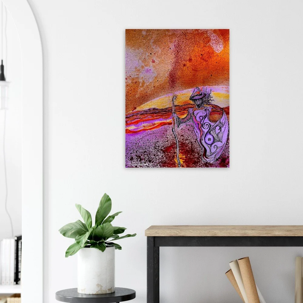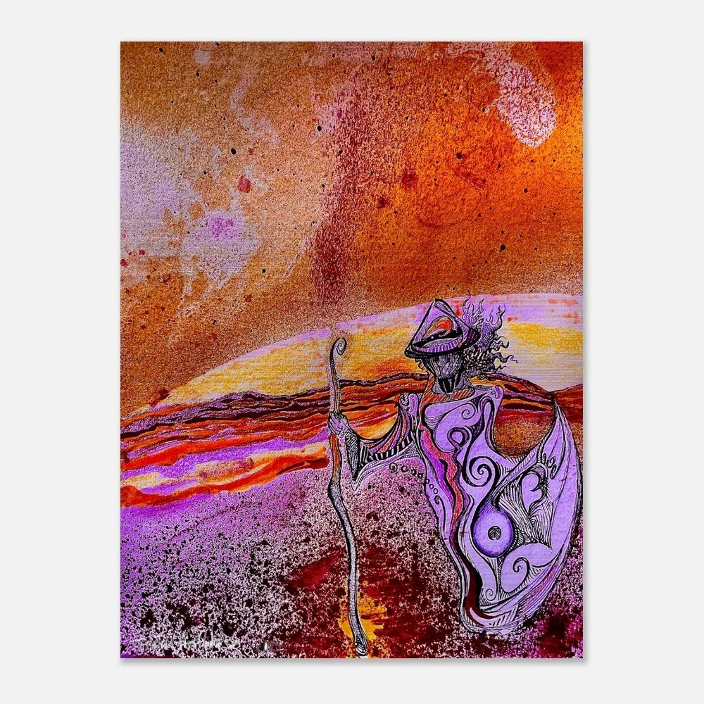 Et verk som vibrerer av bevegelse og tid. «Evighetens reise» fanger øyeblikket mellom det kjente og det uendelige – en vandrer i et landskap av glødende energi, farger i oppløsning og univers som bryter gjennom horisonten. Dette er kunst som løfter rommet, stopper blikket og gir rom for de store tankene. Et uttrykk for kraft, reise, transformasjon.